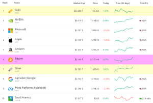 Bitcoin (BTC) market capitalization has overtaken silver following the coin’s surge to a new all-time high above $118,000.